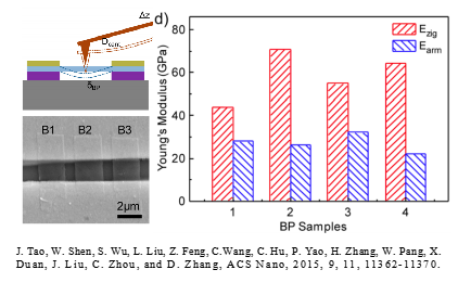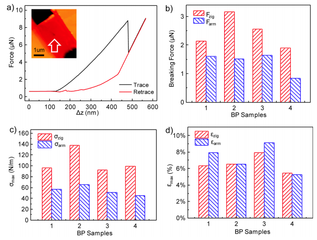 由于黑磷晶體結(jié)構(gòu)的不對稱性,其在光學(xué)、電學(xué)和力學(xué)等方面表現(xiàn)出獨(dú)特的面內(nèi)各向異性。例如,黑磷晶體在armchair和zigzag方向上,楊氏模量、斷裂應(yīng)變和電導(dǎo)率的比值分別為2.2,1.94和1.93。