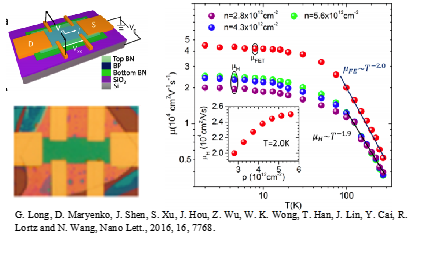 二維黑磷晶體場效應(yīng)晶體管具有超高且隨厚度可調(diào)的載流子遷移率。通過h-BN將黑磷包覆制備的場效應(yīng)晶體管,室溫和2 K低溫下其空穴遷移率可分別高達(dá)5200和45000 cm2/Vs。